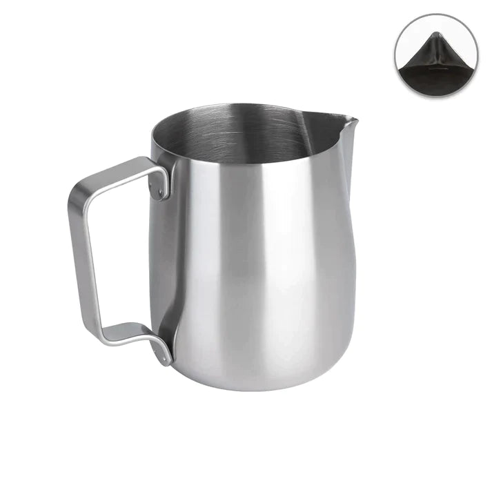 ist die perfekte Wahl für Baristas, die höchste Präzision beim Aufschäumen und Ausgießen verlangen. Der gewölbte Boden und der größere Durchmesser fördern eine ideale Milchzirkulation für besonders feinen Mikroschaum. Mit der verlängerten Ausgusstülle lassen sich klare Linien und feine Details in der Latte Art gezielt gießen. Ein integrierter Füllindikator und der ergonomische Griff sorgen für volle Kontrolle bei jedem Einsatz.